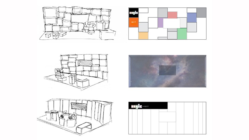 Inspiration was drawn to create a simple exhibit that could create this statement and provide the right atmosphere to interact with staff, test demos and learn more about the lines of research being developed b the organization. The theme is based on building custom experiences, and recognizing the students’ work as the building blocks of the center. Technical drawings were developed for back wall, custom built furnishings and graphic element locations. The exhibit was executed by RES Exhibits in Rochester, NY.